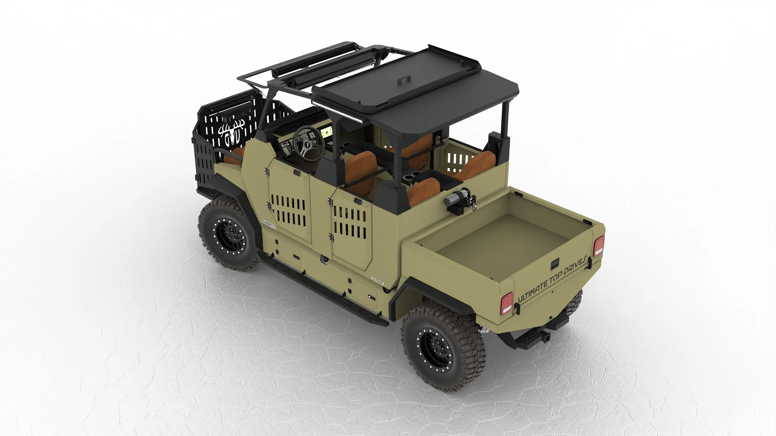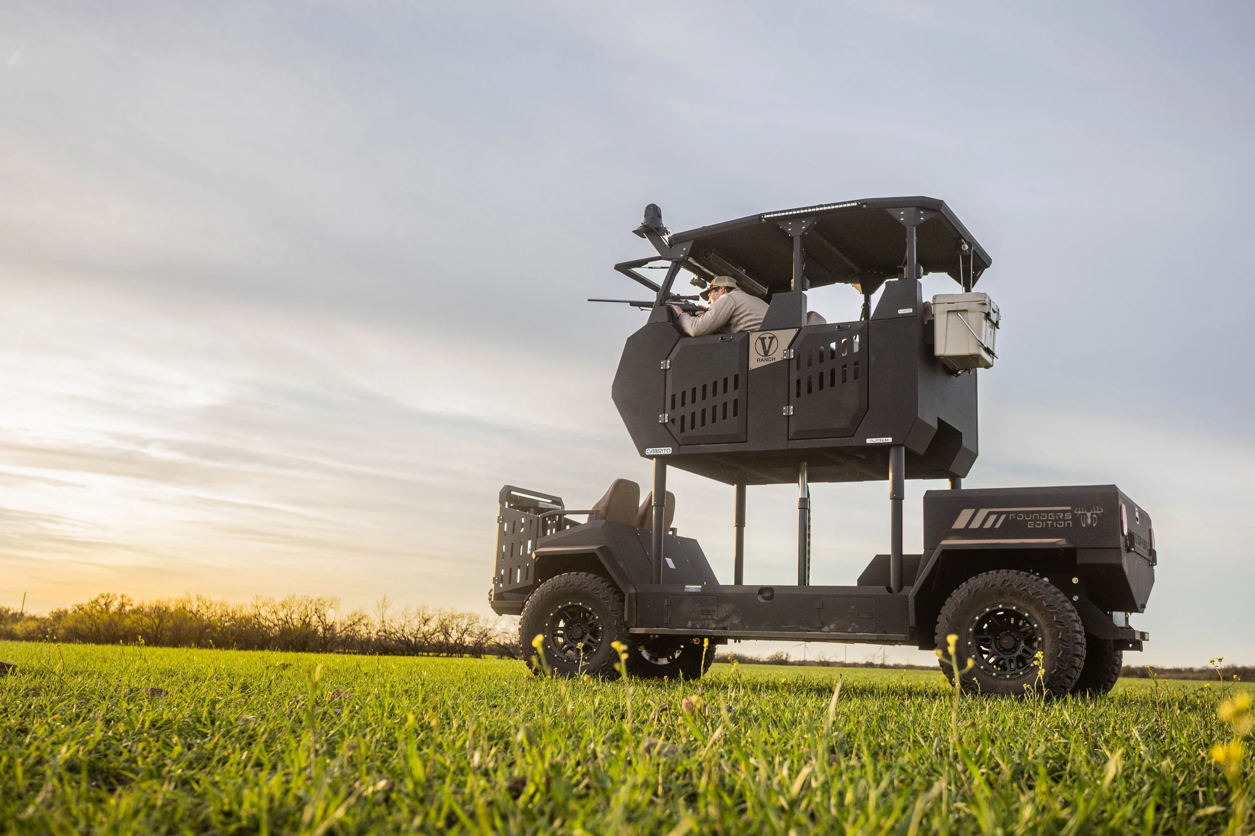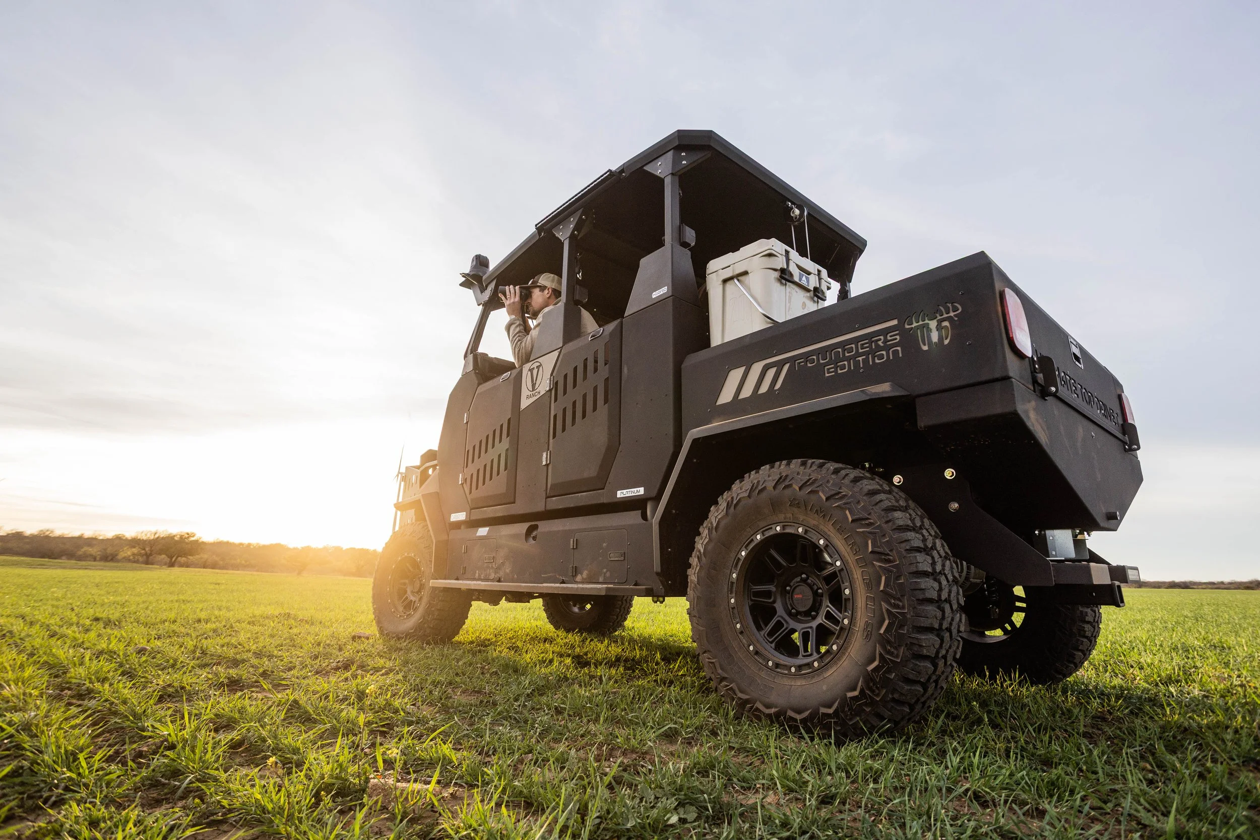 Hybrid-Electric Powertrain (50 mi. Pure Electric Range*)Onboard Range Extender Generator (Additional 75 mi. Range*)Integrated Plug-In ChargerPatented Articulating Passenger Cab (Drive with Cab in Any Position)Full-Time Electric 4WD with Dual High Torque Motors and ControllersFront and Rear Off-Road Coil-Over SuspensionAll Terrain Tires (30” or 32”, Depends on Package)Seating for 4 People in Cab / 2 People on Quail PlatformTouchscreen Information Display and Management SystemMultiple Gun Racks and Cup HoldersRoad Feeder SystemSAFETY FEATURES