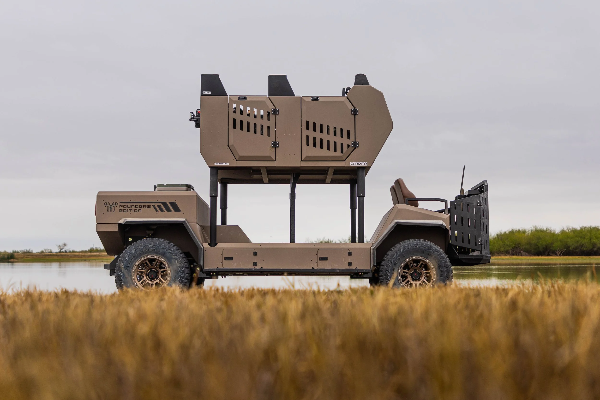 Hybrid-Electric Powertrain (45-50 mi. Pure Electric Range*)Onboard Range Extender Generator (Additional 75 mi. Range*)Integrated Plug-In ChargerPatented Articulating Passenger Cab (Drive with Cab in Any Position)Full-Time Electric 4WD with Dual High Torque Motors and ControllersFront and Rear Off-Road Coil-Over SuspensionAll Terrain Tires (30” or 32”, Depends on Package)Seating for 4 People in Cab / 2 People on Quail PlatformTouchscreen Information Display and Management SystemMultiple Gun Racks and Cup HoldersRoad Feeder System