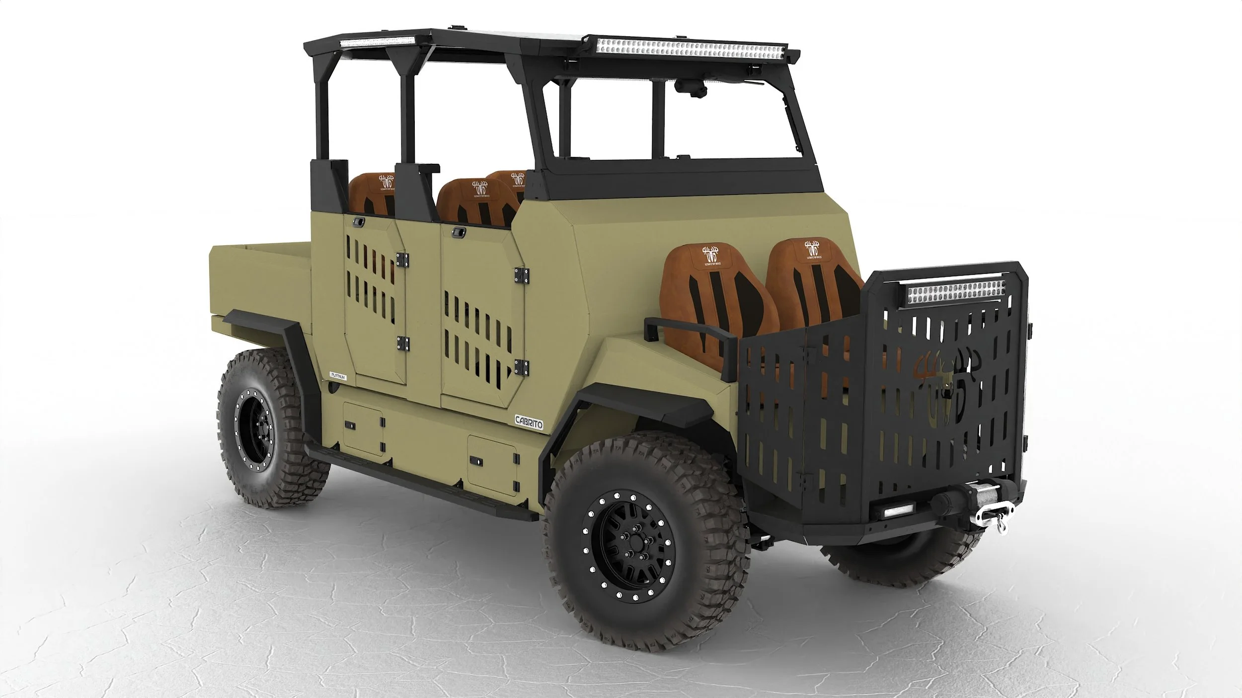 Total Vehicle Load: 1500 lbs.(Passengers, gear, harvested game, etc.)Passenger Cab: 4 people or 900 lbs.Quail Seats / Platform (if Equipped):2 people or 450 lbs.Cargo Bed: 1000 lbs.Road Feeder: 100 lbs.Generator: 8 gallon fuel capacityGun Racks:2 in cab, 2 on quail platform (if equipped)Vehicle models